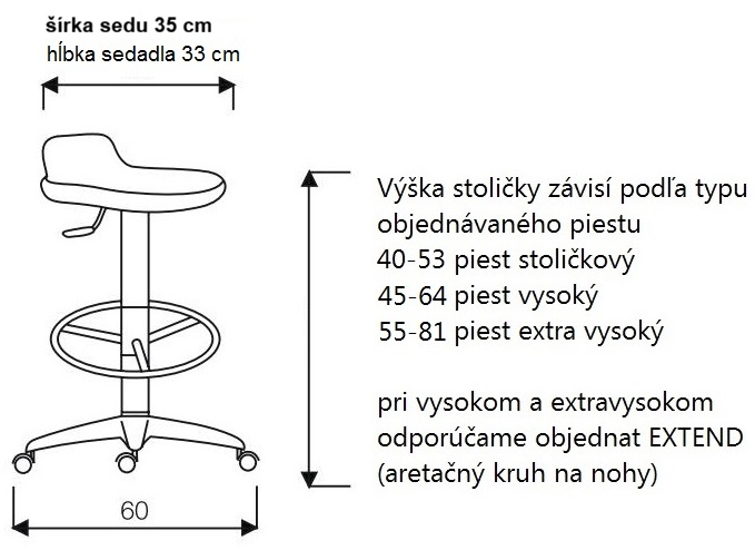 Pro extra vysoký nebo vysoký píst doporučujeme zakoupit EXTEND - Pojistný kroužek - opěrka nohou. V případě pístu židle neplní Extend žádnou funkci, protože uživatel má nohy na zemi. Zároveň doporučujeme, aby v případě vysokého a extra vysokého pístu byla židle pro lepší stabilitu vybavena kluzáky, nikoli kolečky.