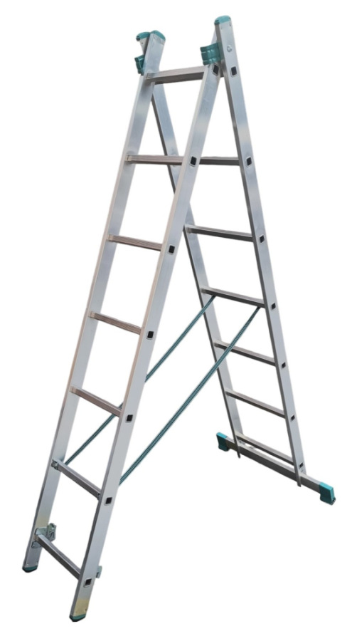 Dvojdielny univerzálny rebrík Eurostyl, počet priečok 2 x 7, max. výsuvná dĺžka 3,14 m a šírka 397 mm.