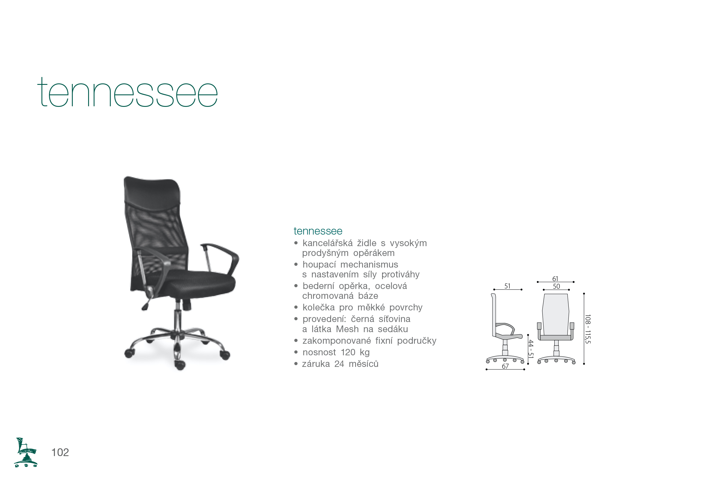 Kancelárska stolička TENNESSEE, vďaka svojej cene, zaujímavému designu a pohodlie patrí medzi najpredávanejšie stoličky na našom trhu. Ocenia ju predovšetkým firmy, ktoré potrebujú pre svojich zamestnancov dobré sedenie za vynikajúcu cenu. Rovnako tak aj jednotlivci, ktorí potrebujú stoličku k počítaču pri vybavovaní domácich pracovísk. Je vybavená základnou hojdacou mechanikou a pevnými podrúčkami.