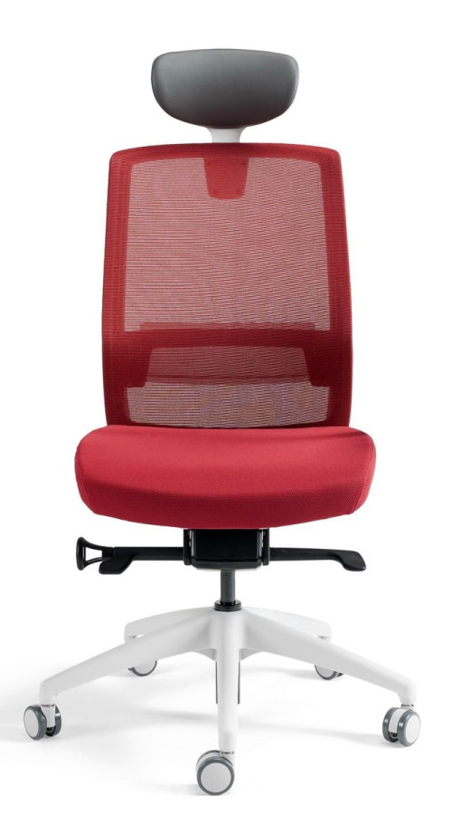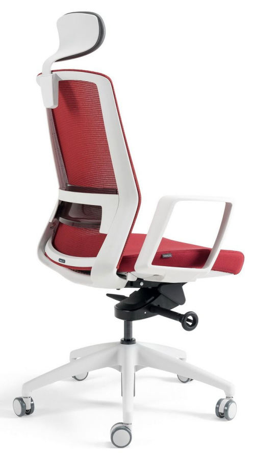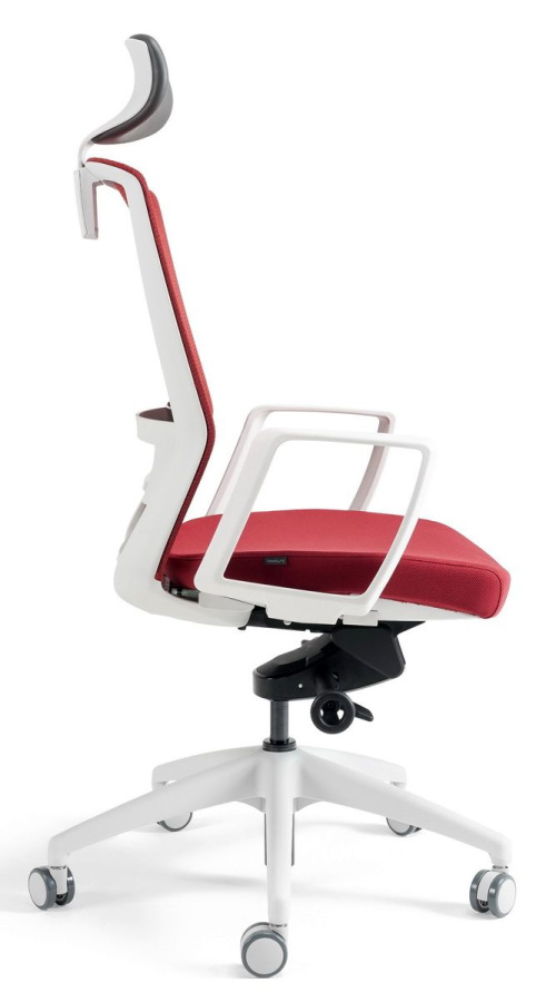 Kancelárska stolička BESTUHL J17 WHITE v bielych farbách konštrukcie a plastov s nastaviteľným podhlavníkom, s priedušným operákom chrbta potiahnutým jemnou sieťovinou - soft touch mesh a anatomickou bedrovou opierkou v prevedení z priesvitného dymového plastu.