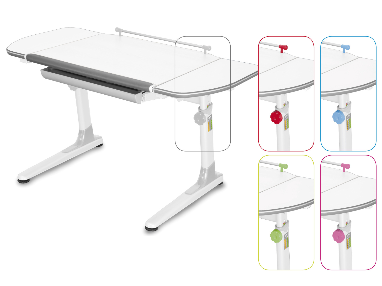 Stôl obsahuje 5 farebných sád plastových prvkov (madlo, skrutky, krytky) – výber z šedej, červenej, modrej, ružovej a zelenej pre ľubovoľné kombinovanie