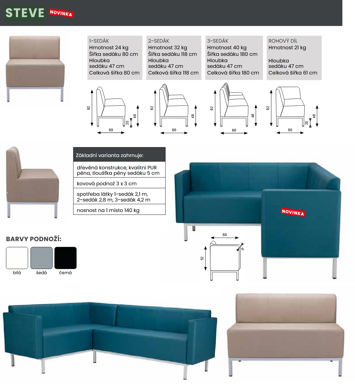 Sedačka STEVE je k dispzícii ako 1-sedadlo, 2-sedadlo, 3-sedadlo, rohový diel a podrúčky.