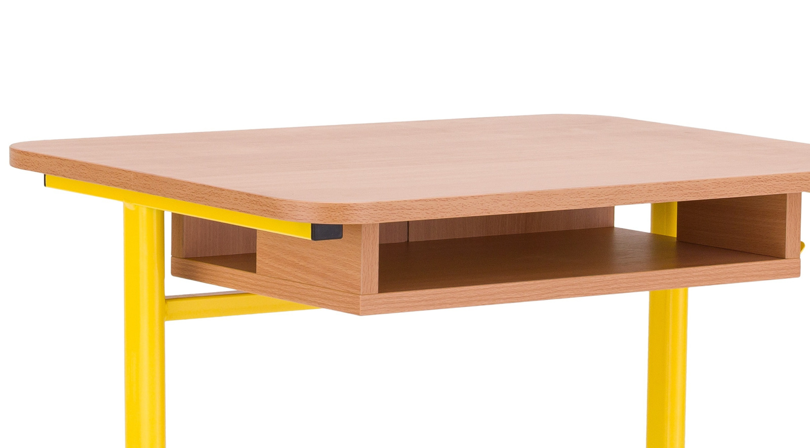Voliteľná odkladacia doska pod pracovnou plochou poskytuje praktický priestor na učebnice, zošity a školské pomôcky bez toho, aby zaberala miesto na stole.